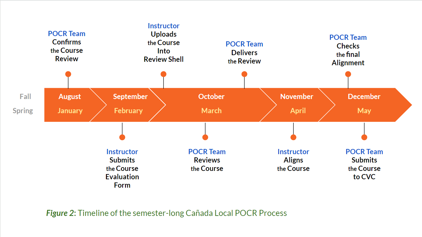 During the academic year 22/23, Cañada’s certified POCR reviewers formed a workgroup that entered the CVC’s certification process called the POCR Capstone. This two-semester process (Figure 1) awarded Cañada College with the Local POCR Certification. The Cañada POCR team can now review courses via the Local POCR Process. At the process completion, such courses receive a quality-reviewed (QR) badge, internally, without the CVC’s supervision. QR courses are entered into the CVC Course Exchange and will eventually become available for statewide enrolment, pending Home & Teaching College Initiative approval (in progress).